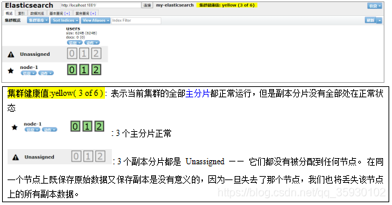 虽然我们拥有所有的三个主分片,但是同时设置了每个主分片需要对应2份副本分片,而此时只存在一份副本分片。 所以集群不能为 green 的状态,不过我们不必过于担心:如果我们同样关闭了 Node 2 ,我们的程序 依然 可以保持在不丢任何数据的情况下运行,因为 Node 3 为每一个分片都保留着一份副本。