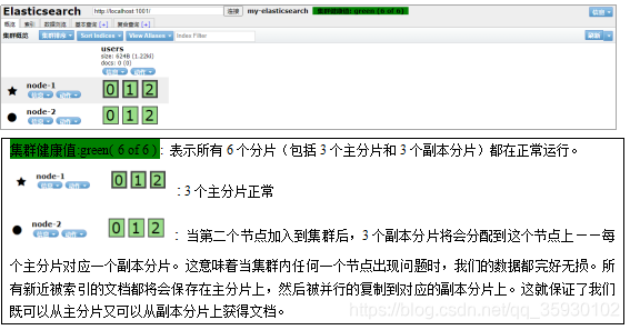 如果启动了第二个节点,我们的集群将会拥有两个节点的集群 : 所有主分片和副本分片都已被分配