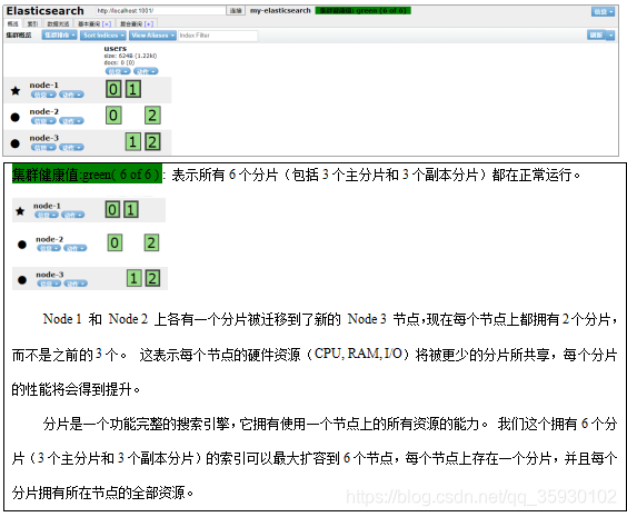通过elasticsearch-head插件查看集群情况,所以我们的集群是一个有三个节点和一个索引的集群。