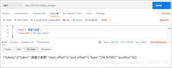 { "tokens": [ { "token": "弗", "start_offset": 0, "end_offset": 1, "type": "CN_CHAR", "position": 0 }, { "token": "雷", "start_offset": 1, "end_offset": 2, "type": "CN_CHAR", "position": 1 }, { "token": "尔", "start_offset": 2, "end_offset": 3, "type": "CN_CHAR", "position": 2 }, { "token": "卓", "start_offset": 3, "end_offset": 4, "type": "CN_CHAR", "position": 3 }, { "token": "德", "start_offset": 4, "end_offset": 5, "type": "CN_CHAR", "position": 4 } ]} 首先进入ES根目录中的plugins文件夹下的ik文件夹,进入config目录,创建custom.dic文件,写入弗雷尔卓德。同时打开IKAnalyzer.cfg.xml文件,将新建的custom.dic配置其中,重启ES服务器。