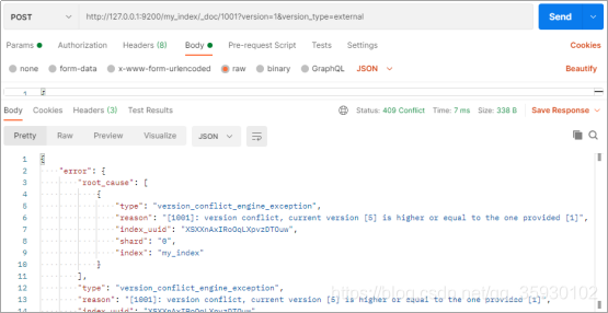 老的版本es使用version,但是新版本不支持了,会报下面的错误,提示我们用if_seq_no和if_primary_term